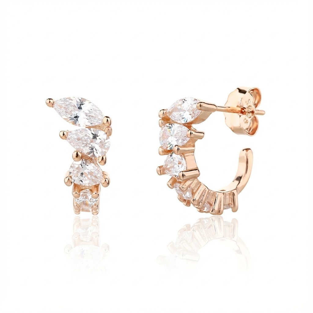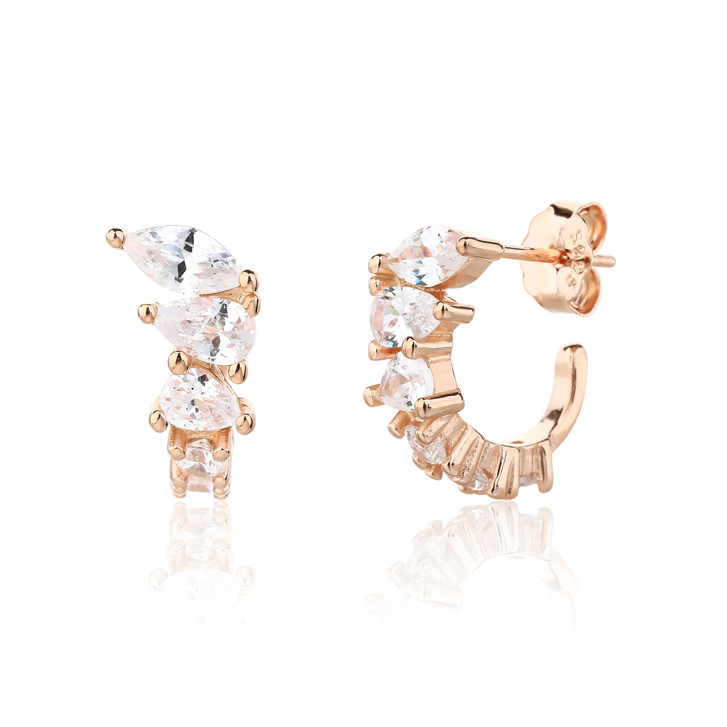 עגילים רוז גולד עשויים כסף 925 מצופה זהב אדום (רוז גולד) ומשובצים באבני זרקון. העגילים מגיעים כזוג.